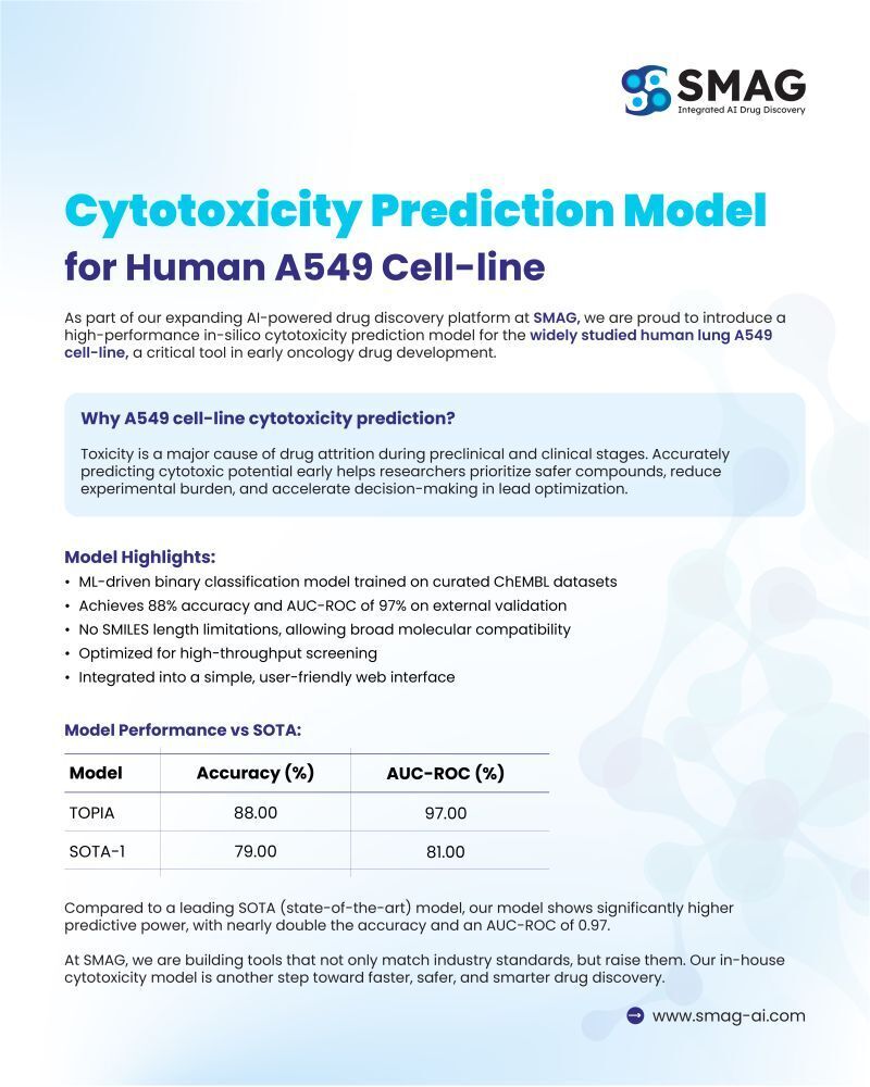 Toxicity will always be a central concern in drug development, but with tools like SMAG’s A549 cytotoxicity prediction model, researchers can mitigate risks earlier, streamline their pipelines, and focus resources on the most promising therapeutic candidates.