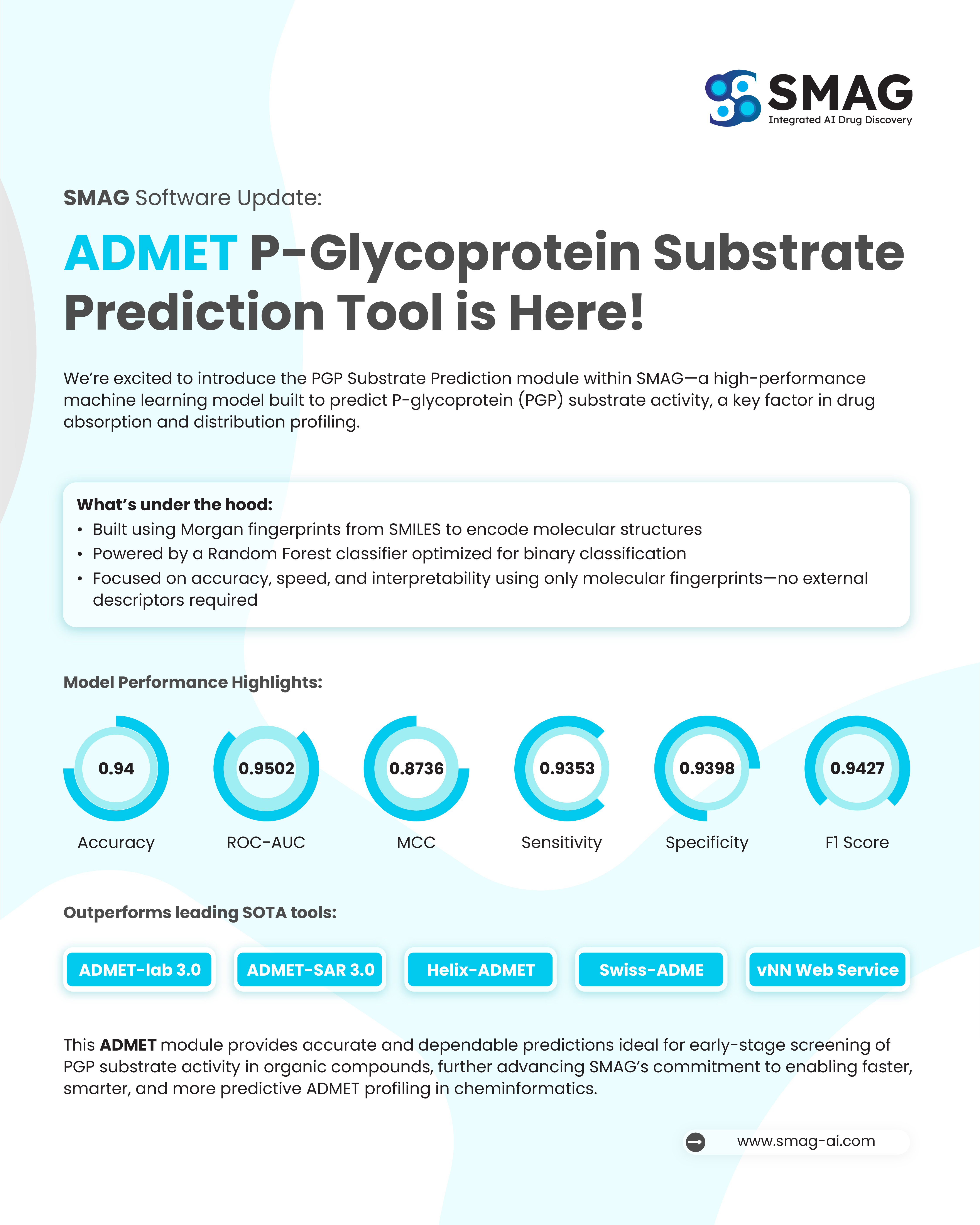 SMAG is proud to unveil the launch of its P‑Glycoprotein (PGP) Substrate Prediction Tool, now integrated into our platform’s ADMET module. This machine learning-driven model marks a new step toward accurate, fast, and interpretable drug toxicity prediction—a crucial component of modern AI in drug development.