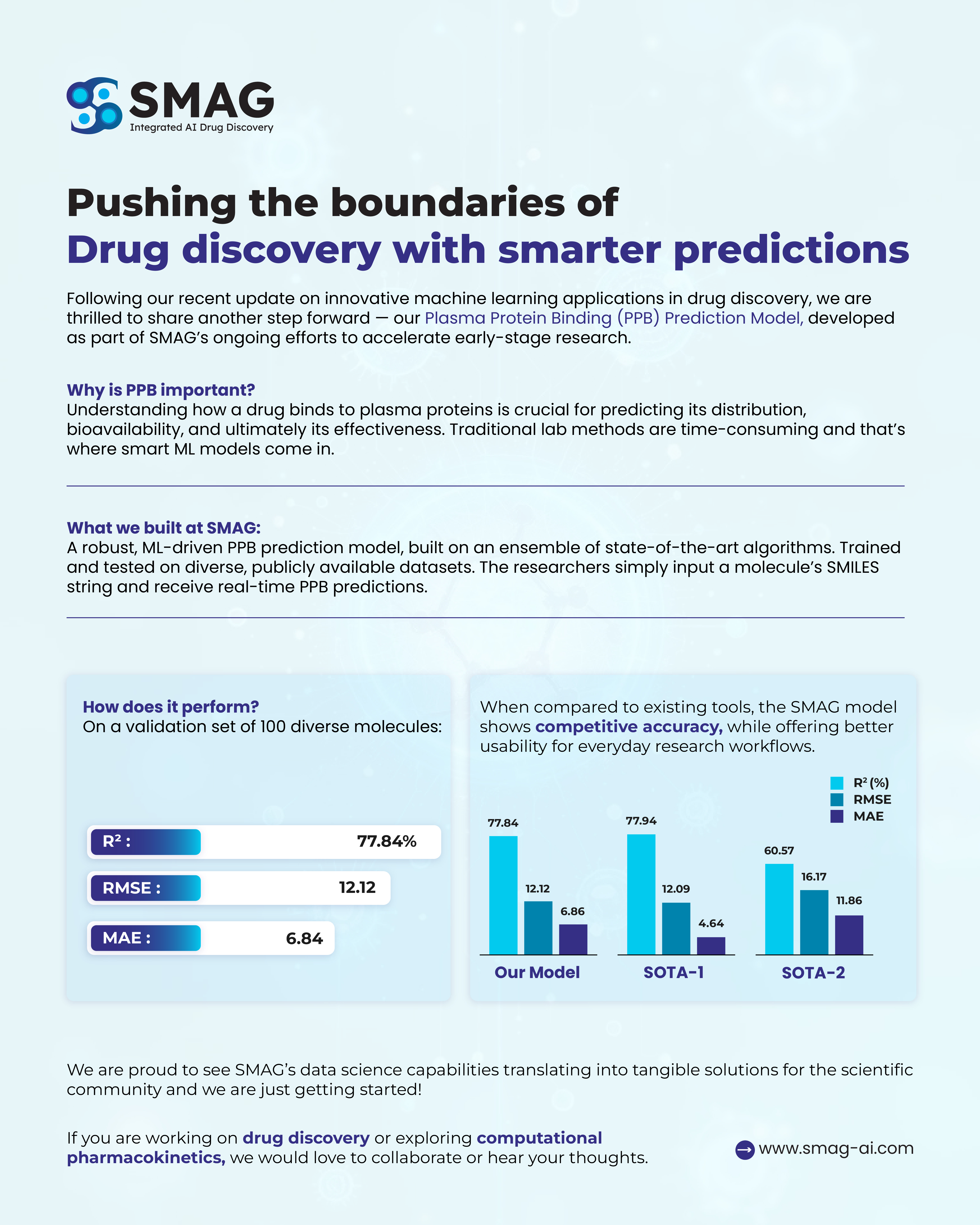 In our continuous effort to streamline and strengthen early drug discovery, SMAG has developed a Plasma Protein Binding (PPB) Prediction Model, designed to help researchers better understand drug distribution faster and with greater efficiency.